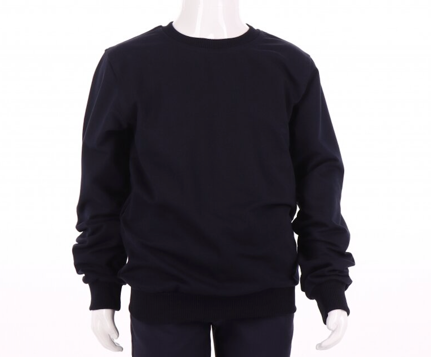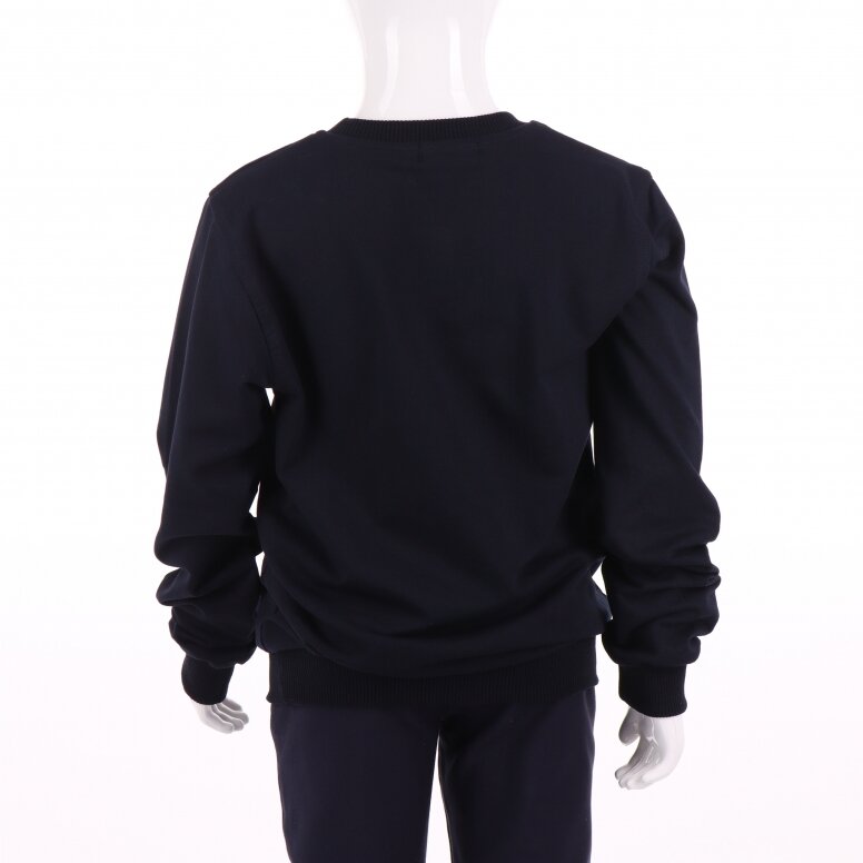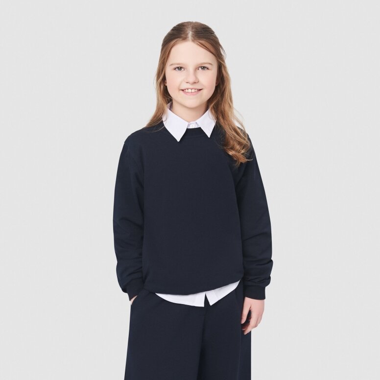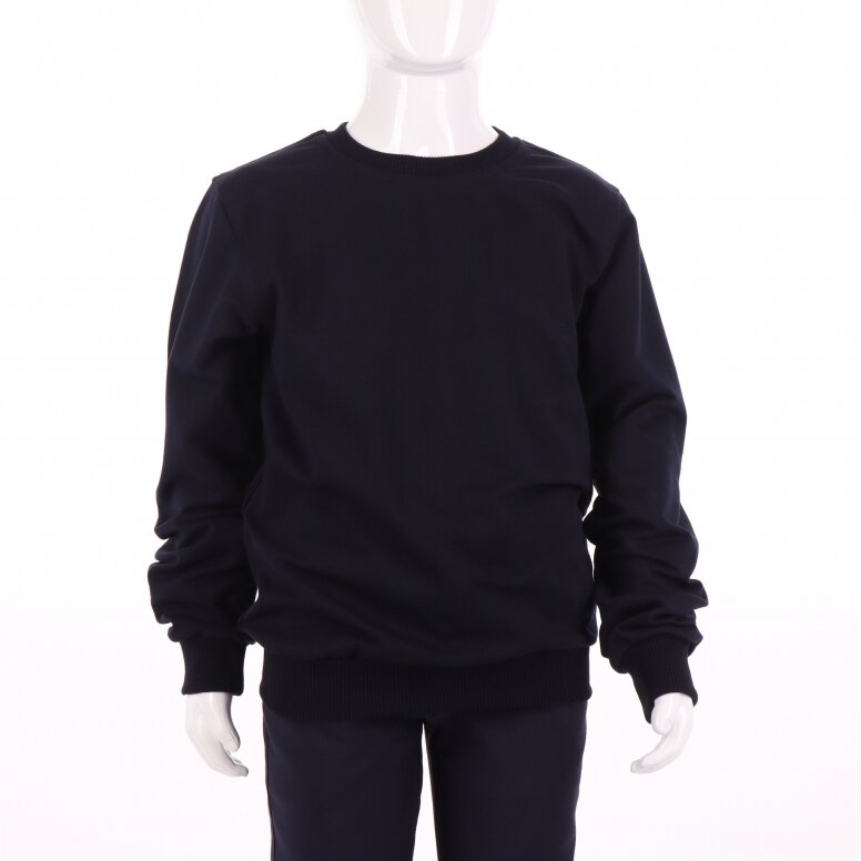 Universalus tamsiai mėlynas mokyklinis džemperis su apvalia iškirpte ir kišenėmis