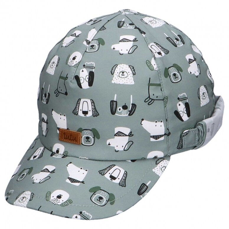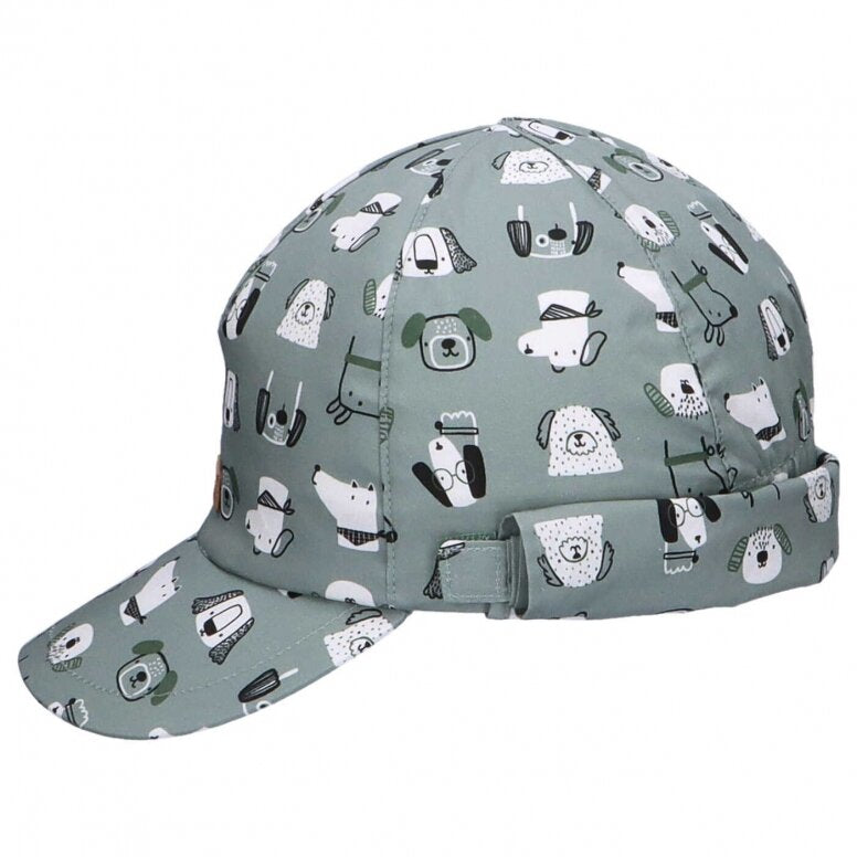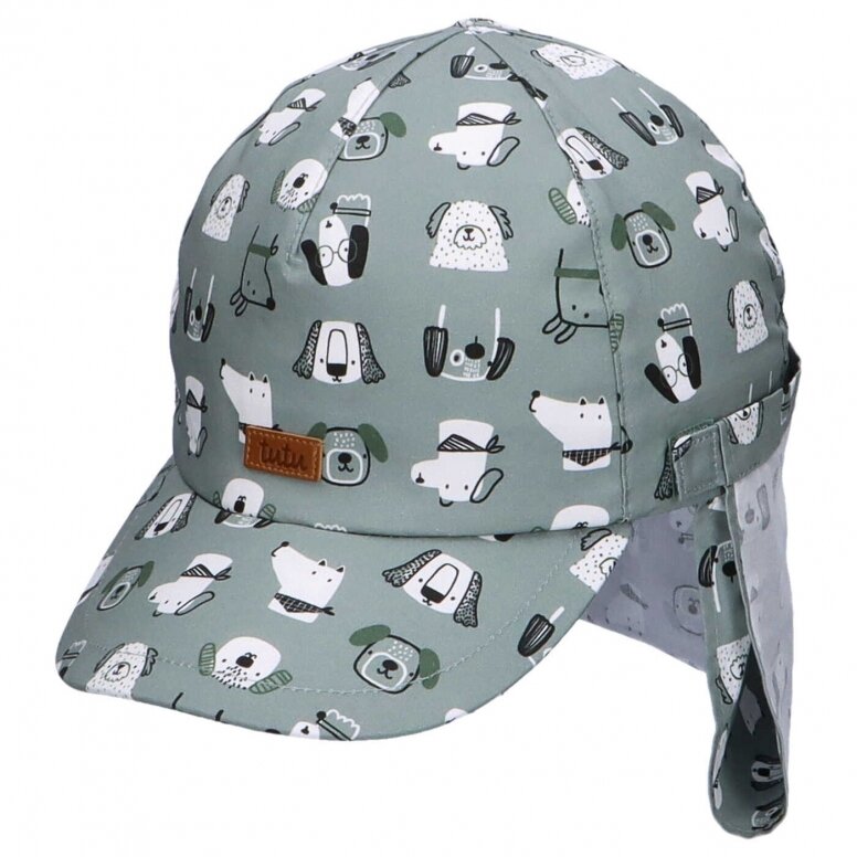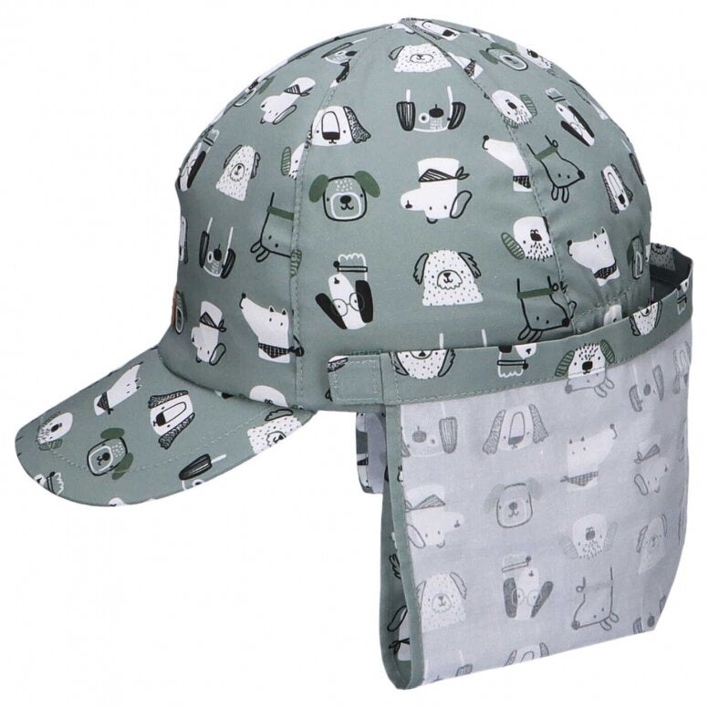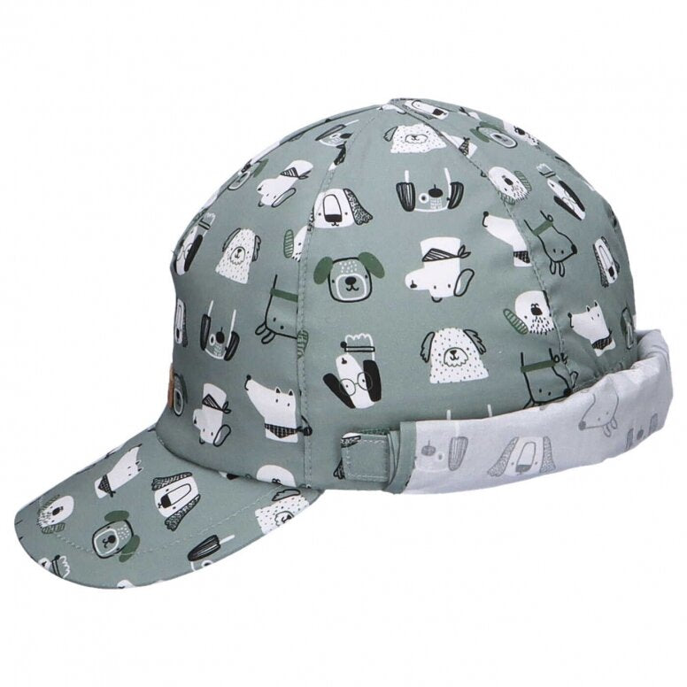 Medvilninė vienguba kepurė su snapeliu ir kaklo apsauga. Kaklo apsauga galima pakelti ir susegti.