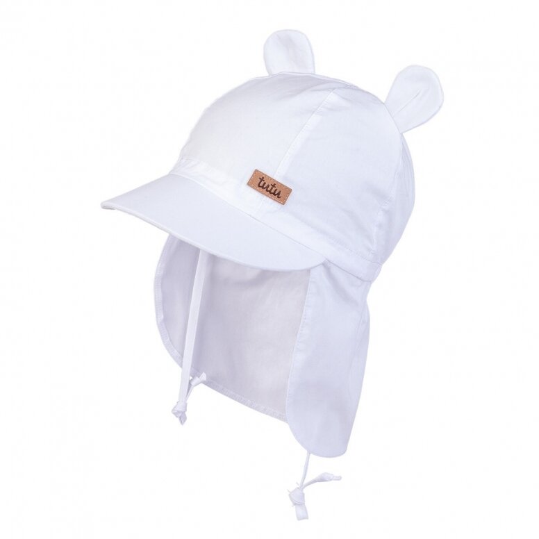 Medvilninė kepurė su raišteliais, su kaklo apsauga, snapeliu ir ausytėmis.